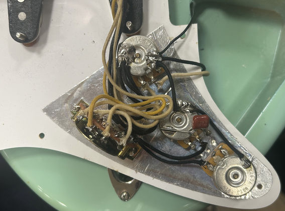 Please see gallery photos. The wiring appears to have been done very neatly, most likely by a professional. The selector switch is a 3-way, and while this is a Fender Japan model, the potentiometers appear to be CTS-type pots. The guitar sounds very bright, and the overall playability is excellent.