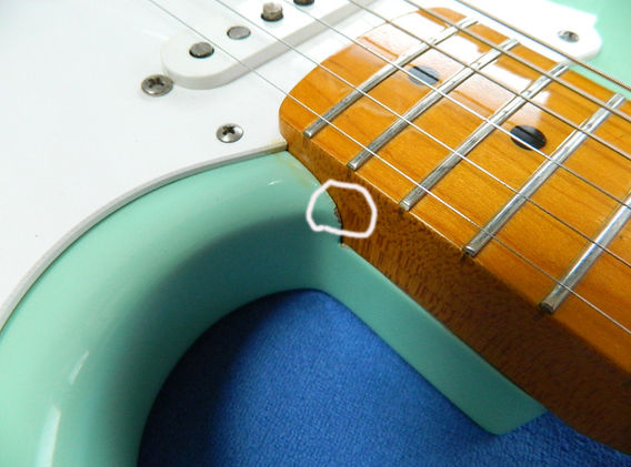There is some tiny paint chipping near the neck joint. (see gallery pic) There are also some minor scratches and dents, and it shows signs of use. Noticeable marks are highlighted in the gallery photos